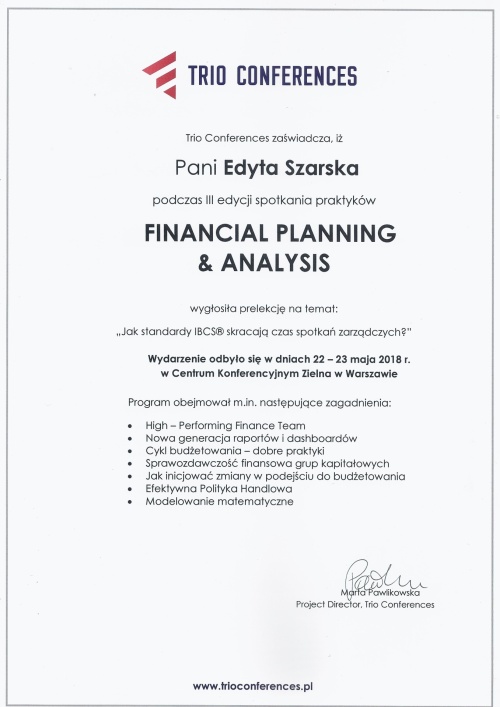 „„Pani Edyta Szarska podczas III edycji spotkania praktyków Financial Planning & Analysis wygłosiła prelekcję na temat: „Jak standardy IBCS® skracają czas spotkań zarządczych?”” Trio Conferences w Warszawie ”